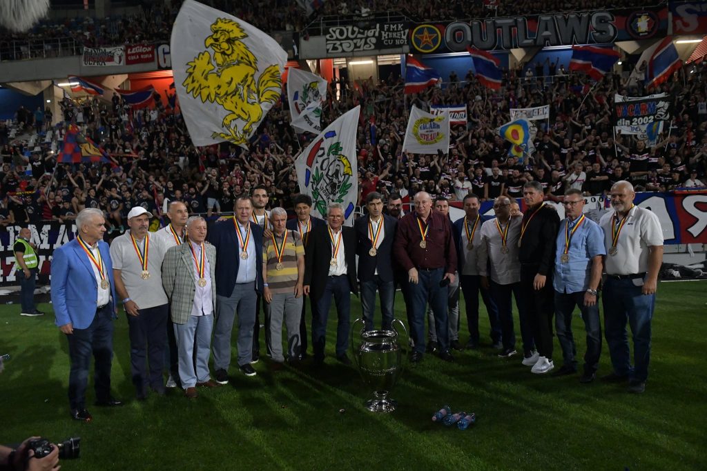 Marele eveniment din Ghencea a început cu o festivitate în care a fost retras tricoul cu numărul 7, purtat de Marius Lăcătuș. Numele adversarului nu a fost ales întâmplător. OFK Belgrad a fost adversara Stelei și la inaugurarea vechiului stadion din Ghencea, în urmă cu 47 de ani. Formația din Serbia joacă în prezent în Liga 3.