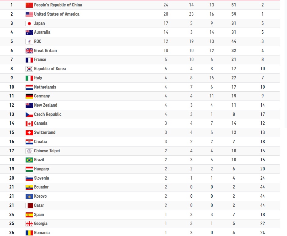 China are 24 de medalii de aur, 14 de argint şi 13 de bronz, fiind urmată acum de SUA, cu 20-23-16, iar Japonia a coborât pe locul al treilea, cu 17-5-9, etc.