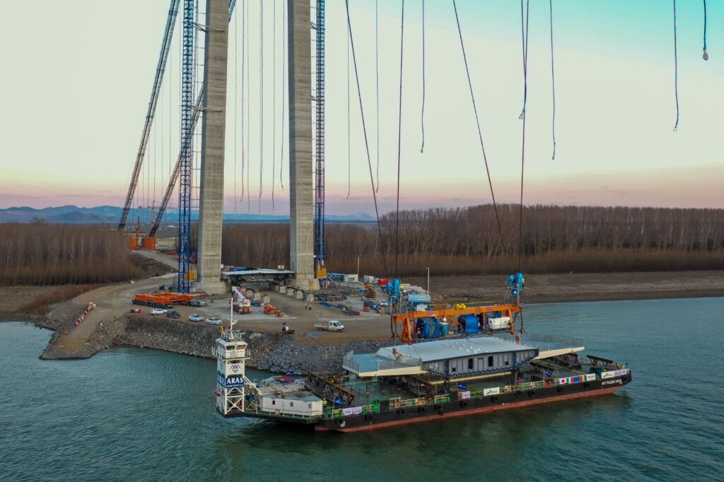 Constructorii care lucrează la pod au ridicat primul segment de tablier metalic în urmă cu aproape o lună, după ce, pe 15 februarie, acesta – primul din cele 86 de segmente care vor forma structura suprafeţei de rulare a podului – a ieşit pe porţile Şantierului Naval Brăila, unde a fost realizat.