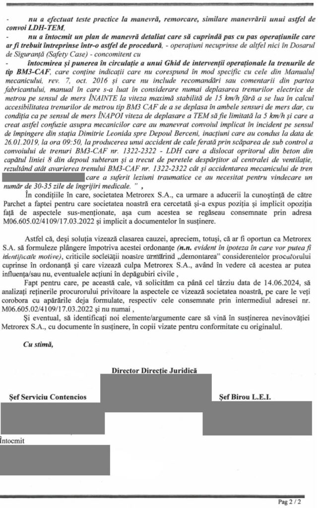 La nici o lună de zile după emiterea Ordonanței de către Parchet, pe 7 iunie 2024 Biroul L.E.I din Serviciul Contencios, Direcția Juridică a METROREX emitea un document cu nr. M03.01.01/810/07.06.2024. Acesta vine cu o serie de interpretări la Ordonanţa Parchetului, care avantajează METROREX dar dezavantajează persoana lui G.B., după cum se lasă indirect de înțeles. De asemenea documentul dovedește deranjul față de „criticile” aduse de Ordonanță față de METROREX. S-a solicitat de asemenea formularea unei plângeri împotriva Ordonanței.