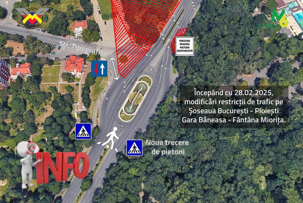 Metrorex anunță modificări ale restricțiilor de trafic din zona Fântâna Miorița, Gara Băneasa, Șoseaua București – Ploiești, până pe 15 mai 2025, pentru continuarea lucrărilor la viitoarea linie de metrou M6 1 Mai – Otopeni, secțiunea Sud, 1 Mai – Tokyo