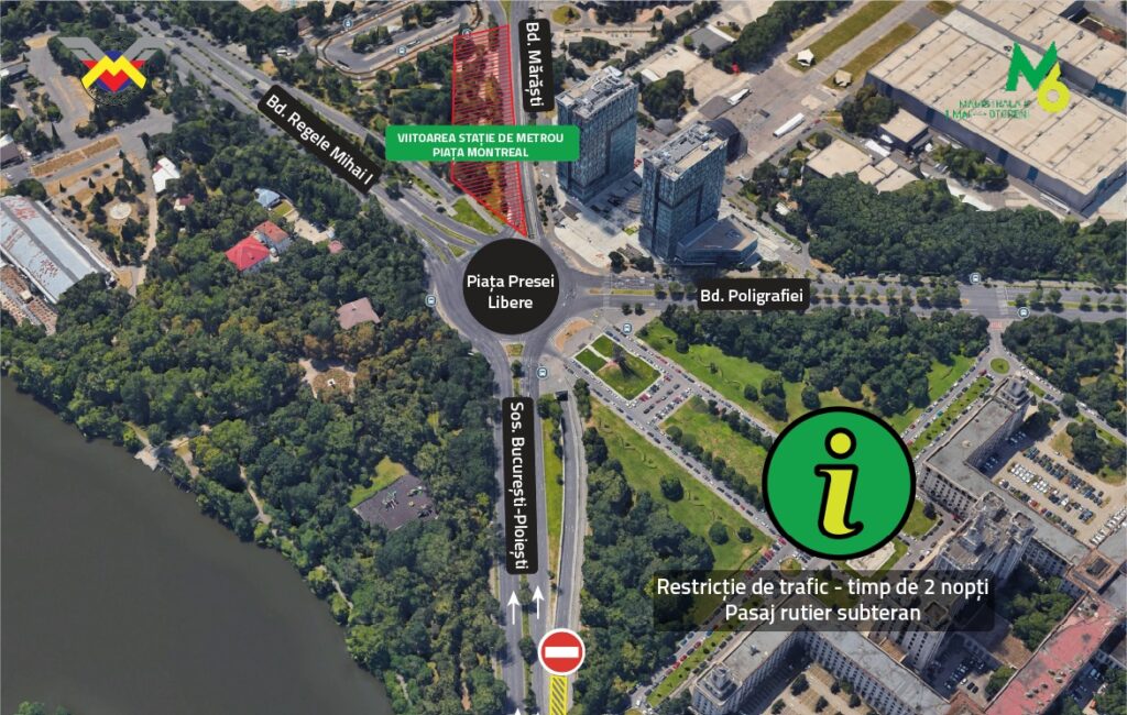 Accesul în Pasajul Piața Presei Libere va fi restricționat în nopțile de 21/22 aprilie și 22/23 aprilie 2026, în intervalul orar 23:00 – 05:00, ca urmare a lucrărilor desfășurate la viitoarea Magistrala 6, anunță Metrorex.